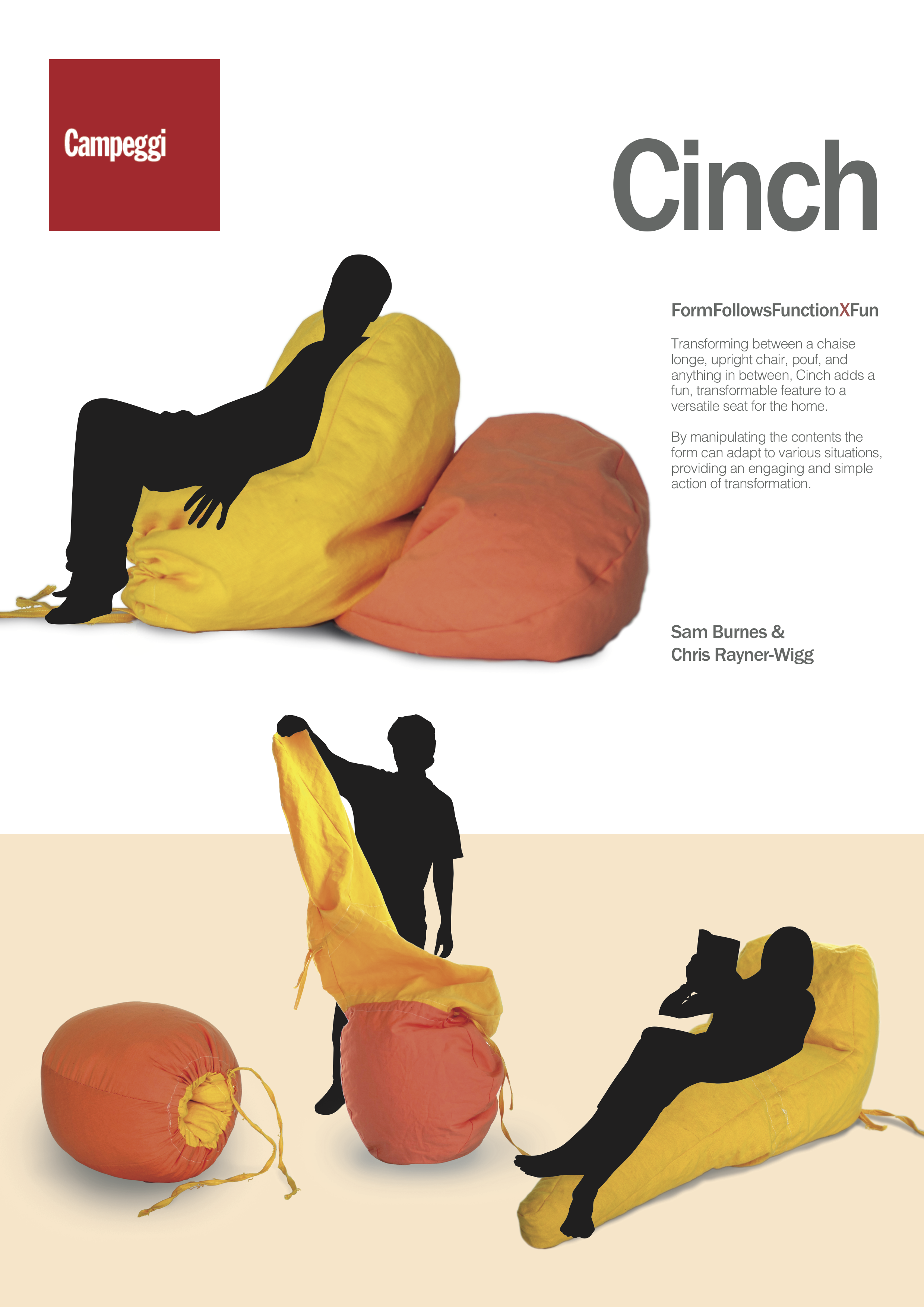 Cinch builds upon the classic Sacco (bean bag chair), introducing a fun and interactive element which enables the user to change the piece from chaise longe, into upright chair, or into a pouf through a simple transformation.